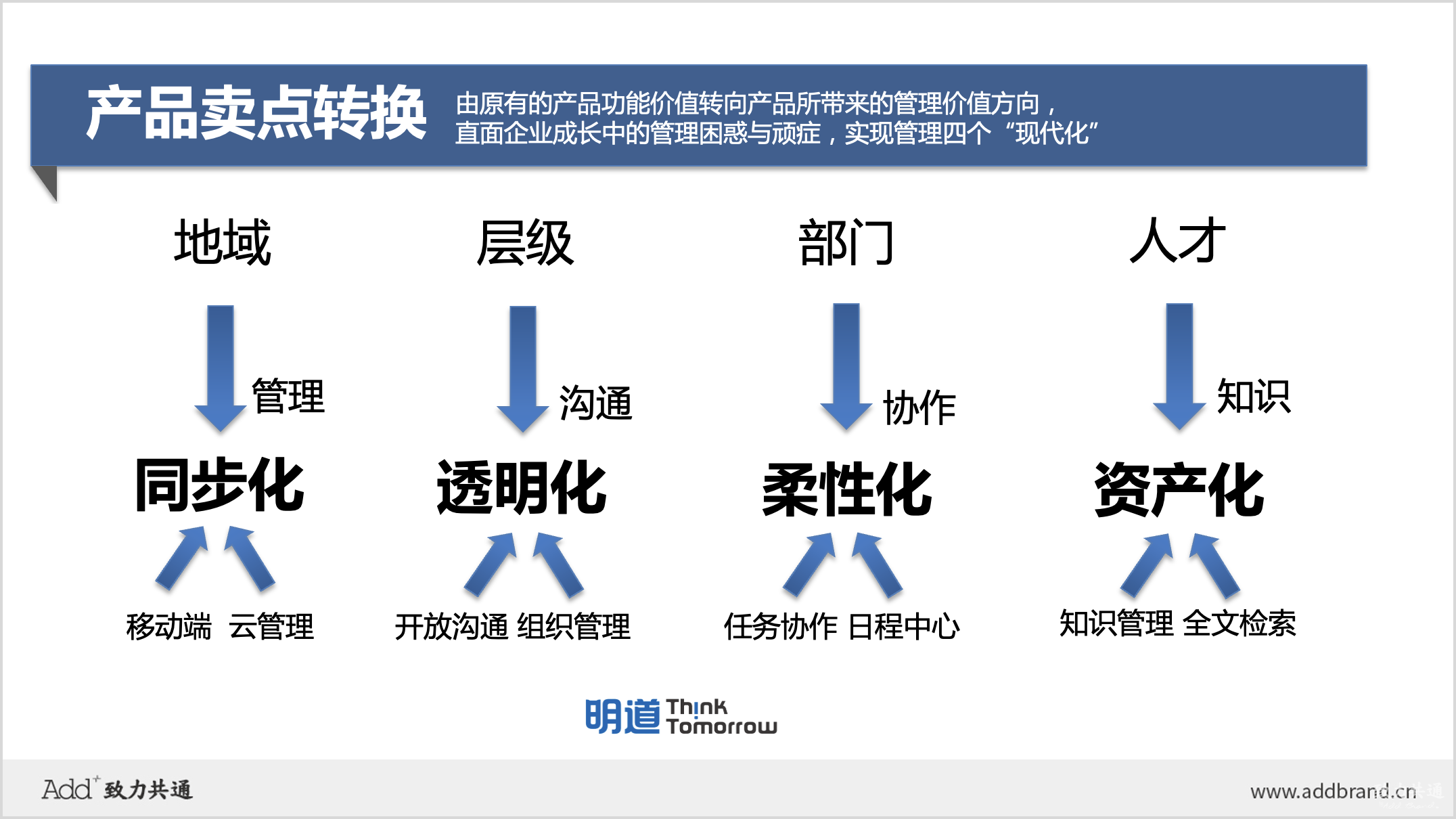 產(chǎn)品賣點的提煉,是這一步工作的重心。通過深入分析明道的產(chǎn)品功能,ADD認為,必須直面企業(yè)成長中的管理困惑與頑癥,讓企業(yè)采購者意識到明道產(chǎn)品的實際價值。因此,在廣告?zhèn)鞑ブ?,產(chǎn)品的“功能價值”必須轉(zhuǎn)化成“管理價值”。