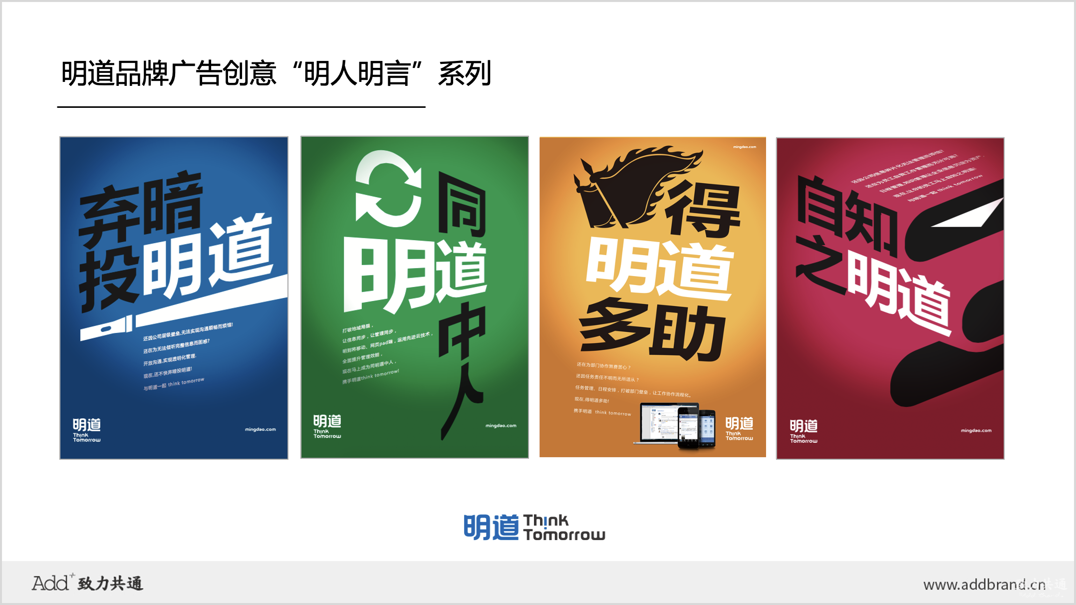 與此同時,ADD為明道所策劃的系列廣告“明人明言”,登陸第一財經(jīng)媒體、戶外媒體,獲得業(yè)界內(nèi)外高度關(guān)注。同時,該系列創(chuàng)意榮獲第16屆IAI平面廣告獎,成為當(dāng)年SaaS領(lǐng)域唯一入選《中國廣告年鑒》的營銷案例。