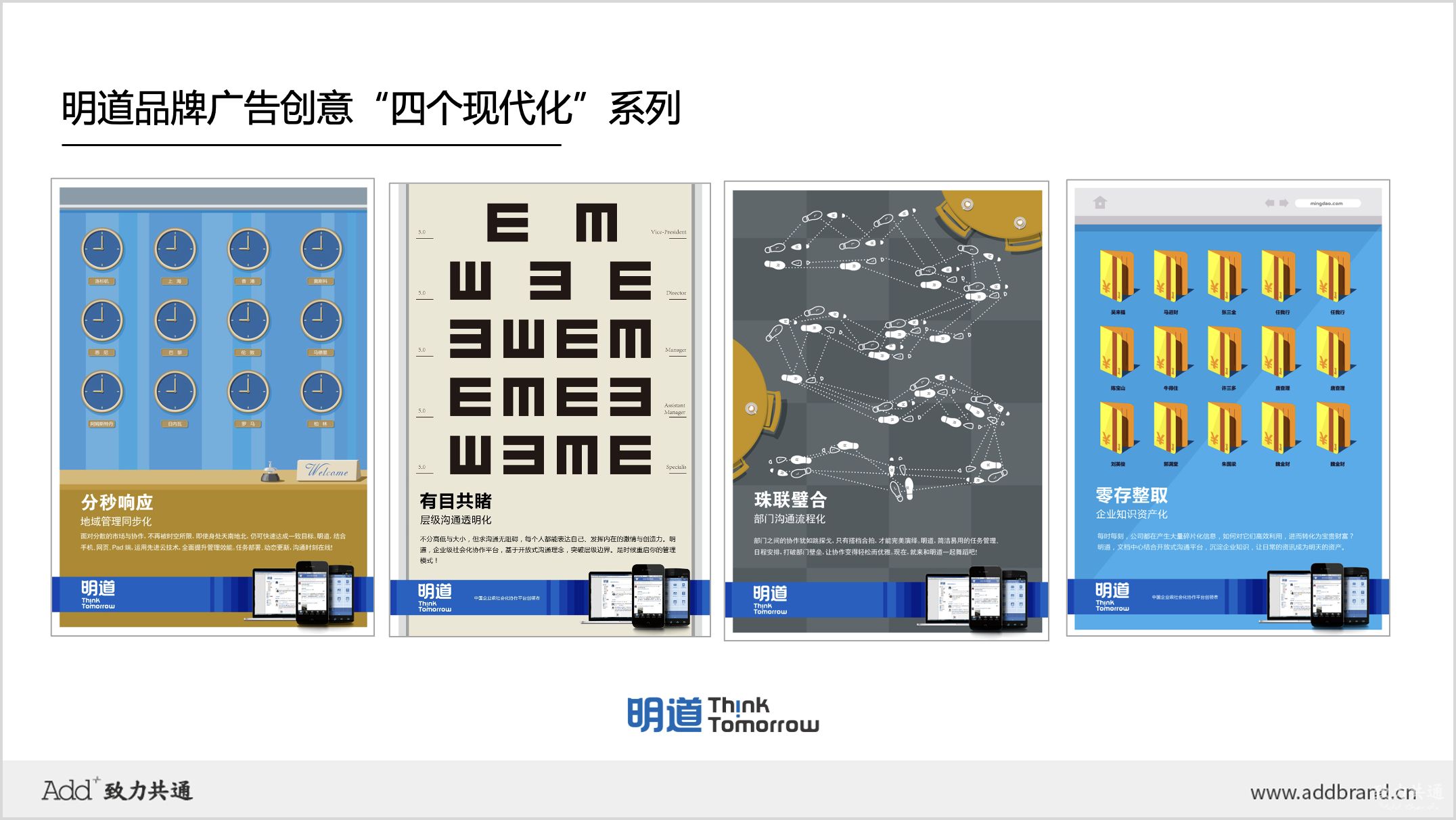 ADD根據(jù)明道的“四大管理價值”,創(chuàng)作了四則趣味畫面,分別是“棄暗投明、同道中人、得道多助、自知之明”。