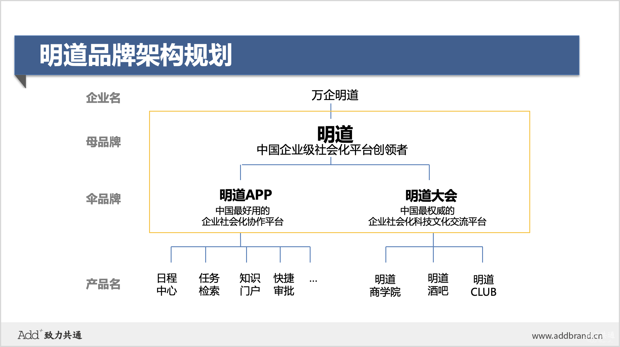 ADD深入研究明道企業(yè)與產(chǎn)品,為其清晰梳理了整個品牌架構(gòu),將明道的產(chǎn)品品牌與平臺平臺,進行了明確的區(qū)隔,以相互助力,并規(guī)劃了品牌的中長期發(fā)展路徑。