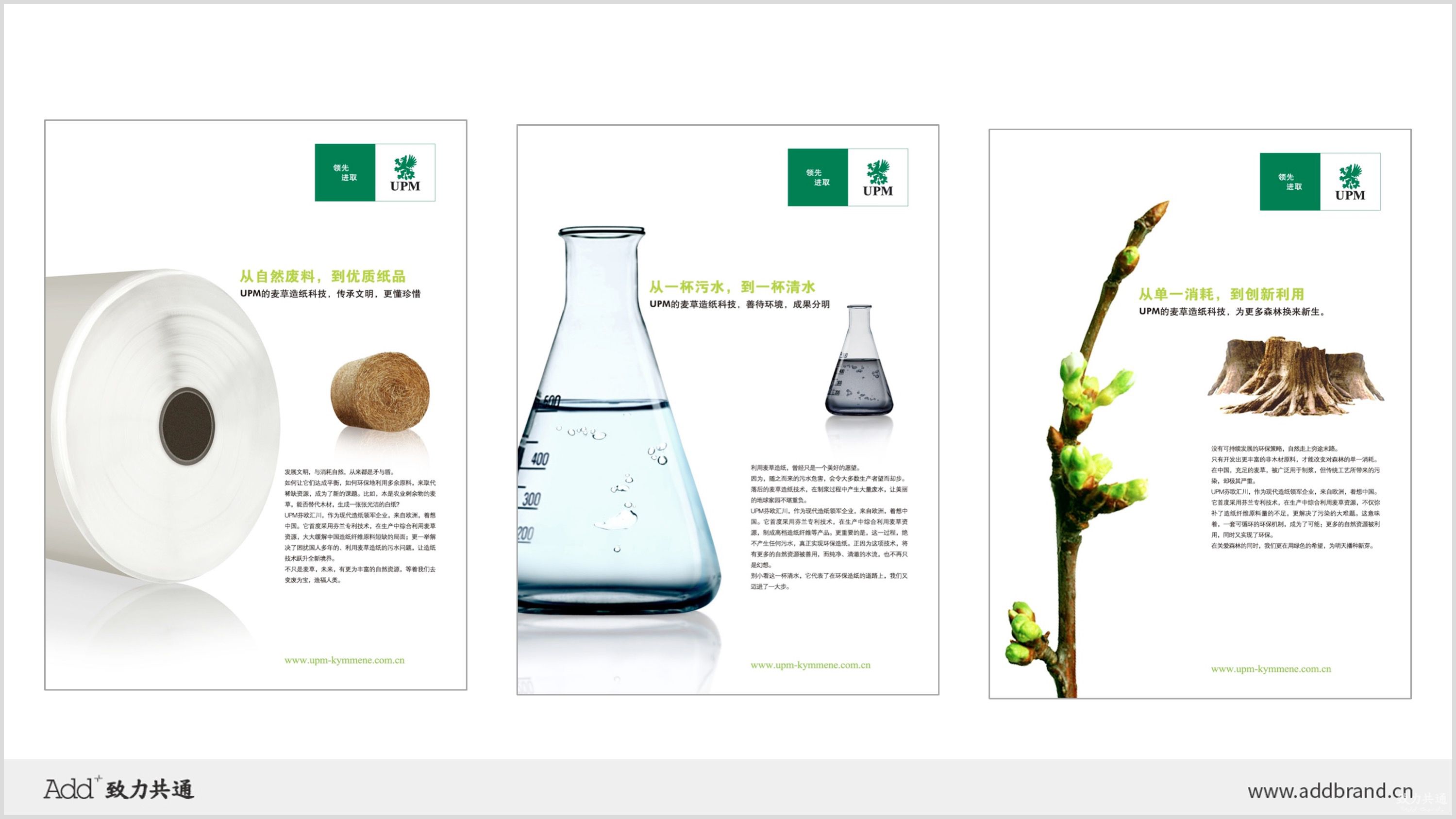 1998年,UPM邁入中國市場,多年專注于建設(shè)渠道、經(jīng)銷商體系以及工廠生產(chǎn)管理,在廣告宣傳上,非常低調(diào)。視覺上一直延用的是來自UPM總部統(tǒng)一的品牌風格:嚴謹、簡潔、大面積留白,始終強調(diào)綠色環(huán)保理念。