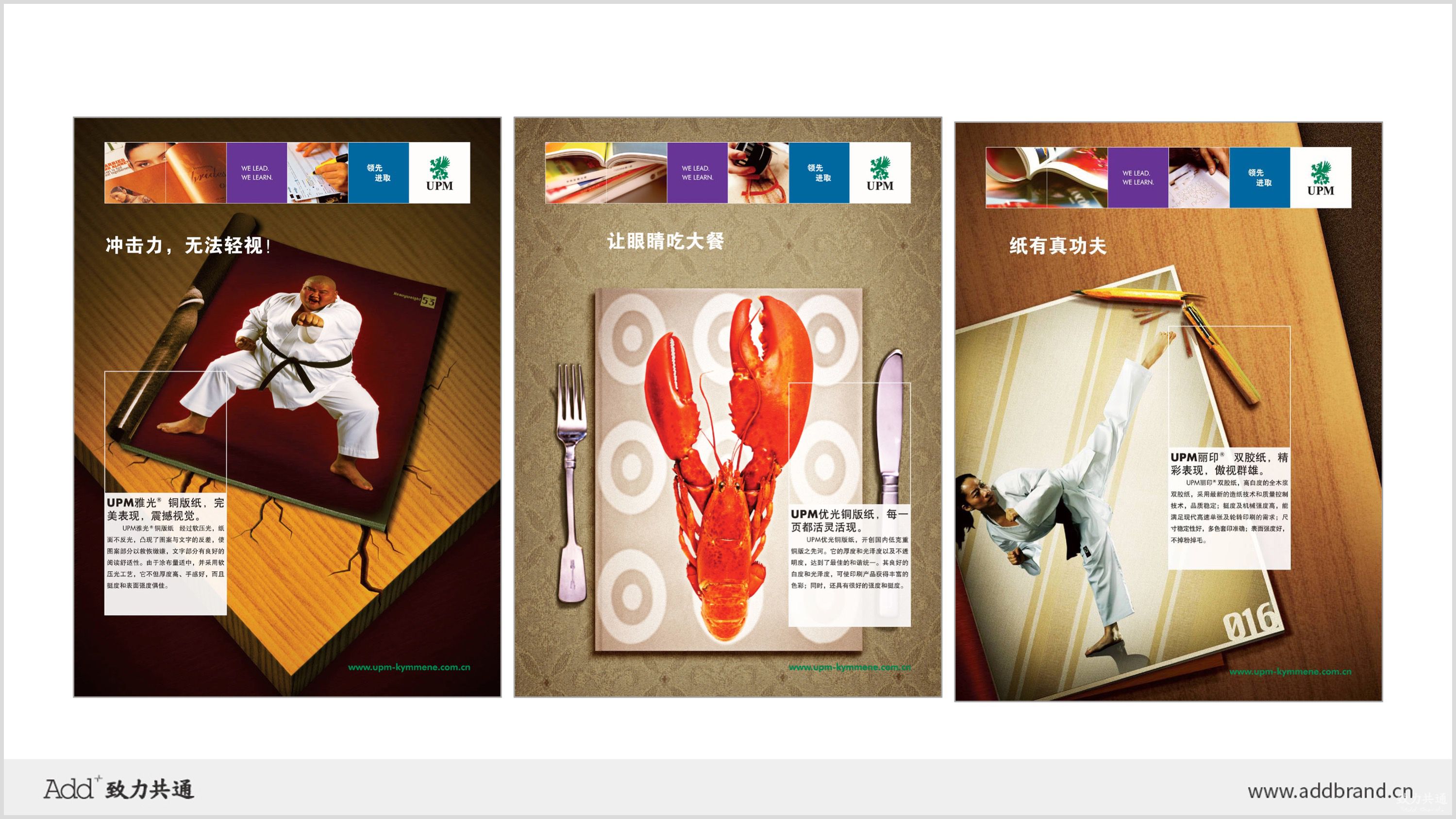 2008年,ADD品牌策劃團隊開始接手UPM廣告營銷工作,在嚴格遵照UPM品牌VI視覺識別系統(tǒng)的前提下,為其策劃了多款創(chuàng)意方案。
