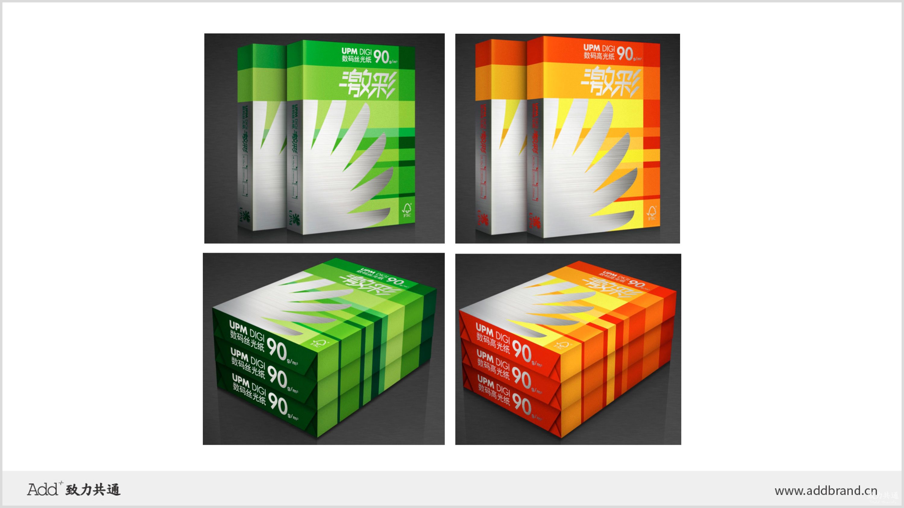 針對產(chǎn)品包裝,ADD也做了很多突破性的創(chuàng)新,為UPM“激彩”系列激光打印紙,設(shè)計了炫彩、亮麗的外包裝,獲得銷售渠道的好評。