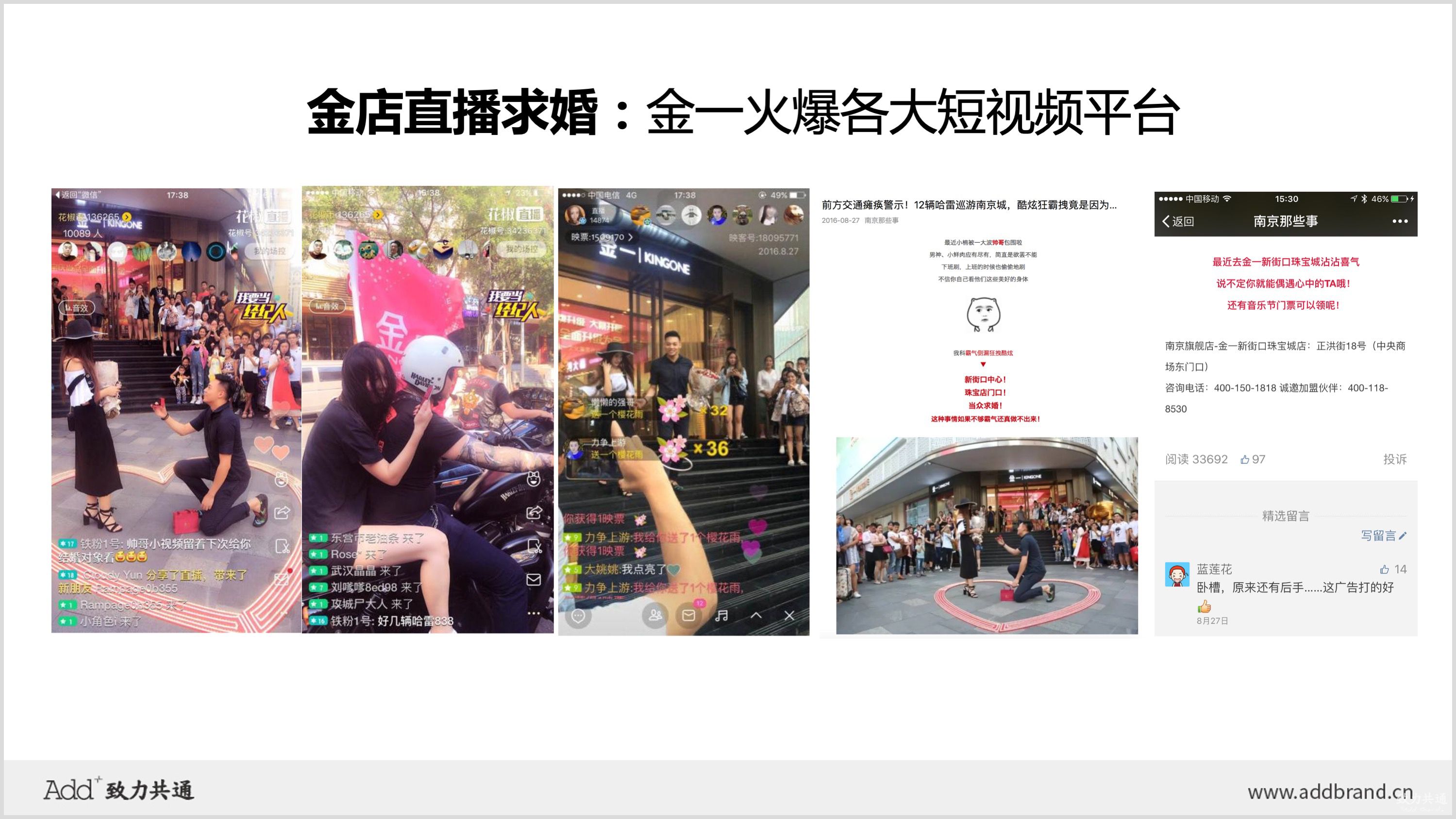 驚險故事居然成了求婚場面!群眾猝不及防被塞了狗糧,紛紛在朋友圈傳播。同時,市民們發(fā)現(xiàn),在各大直播平臺、時尚大V公眾號、城市公交車身等媒體,同時出現(xiàn)了金一的廣告。