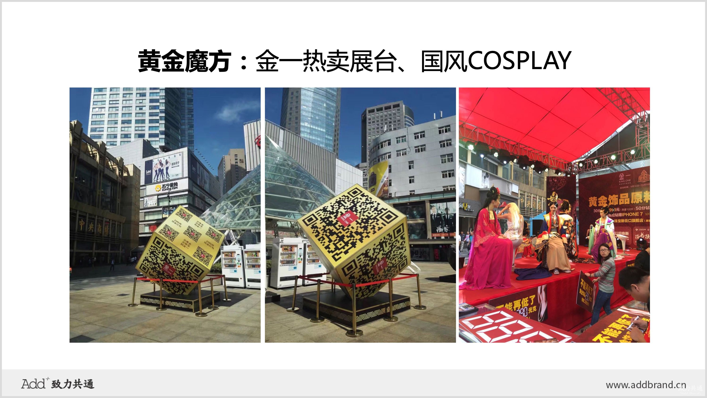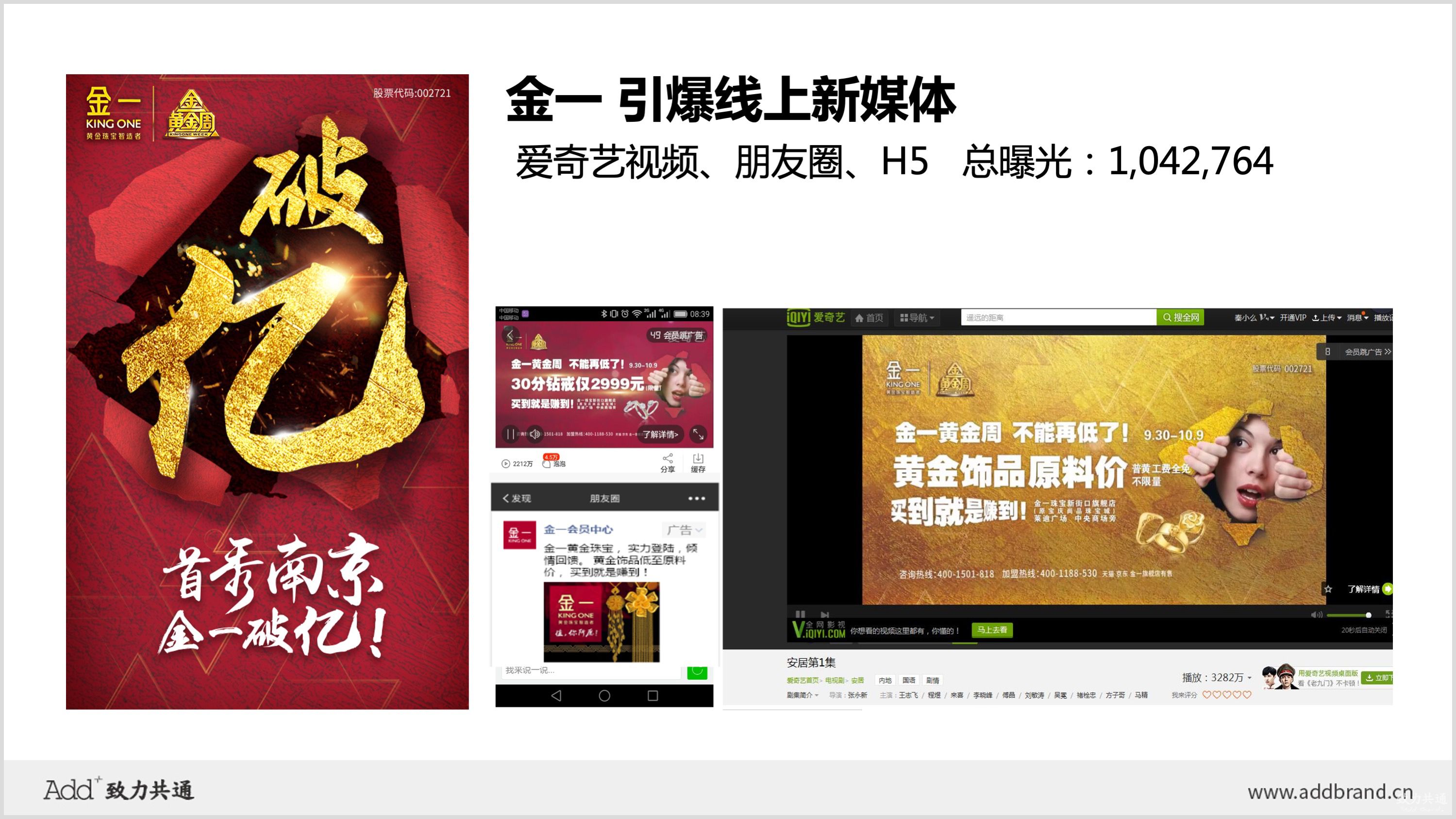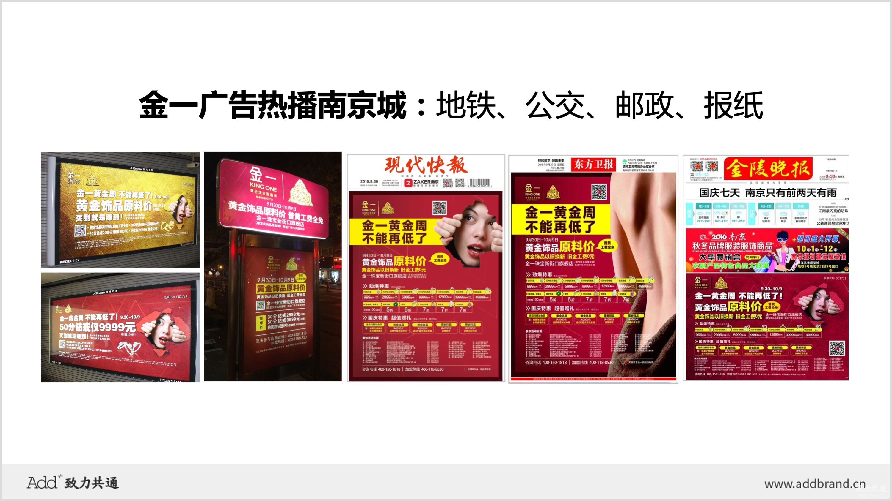 國慶過后,ADD趁熱打鐵,整合線上與線下媒體,雙管齊下,以黃金周“銷售破億”、“黃金飾品低至原料價”為話題,放大金一的熱銷盛況與話題性。同時,協(xié)助金一南京團(tuán)隊,啟動“雙十一、圣誕、新年”的營銷策劃。