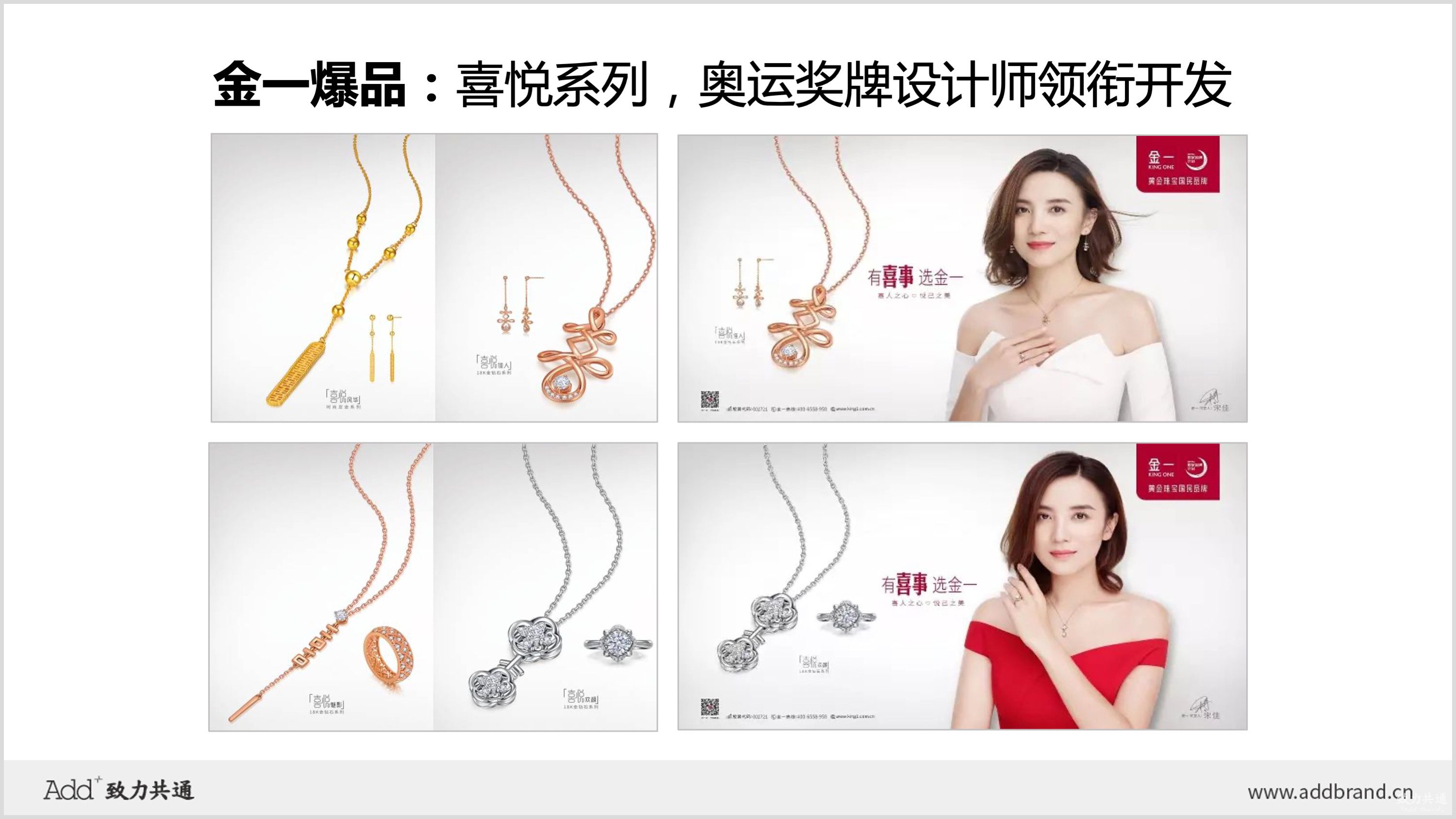 結(jié)合運(yùn)動(dòng)、休閑、時(shí)尚、清新、職業(yè)OL等不同風(fēng)格調(diào)性,運(yùn)用明星效應(yīng),相繼推出了周冬雨、李天愛(ài)、陳曉、譚維維、倪妮、宋佳等當(dāng)紅明星參與設(shè)計(jì)的產(chǎn)品套系,打造獨(dú)一無(wú)二的明星款式。金一子品牌“喜悅”,由北京奧運(yùn)會(huì)獎(jiǎng)牌設(shè)計(jì)師肖勇領(lǐng)銜開(kāi)發(fā),并推出專業(yè)團(tuán)隊(duì)設(shè)計(jì)的明星代言廣告。