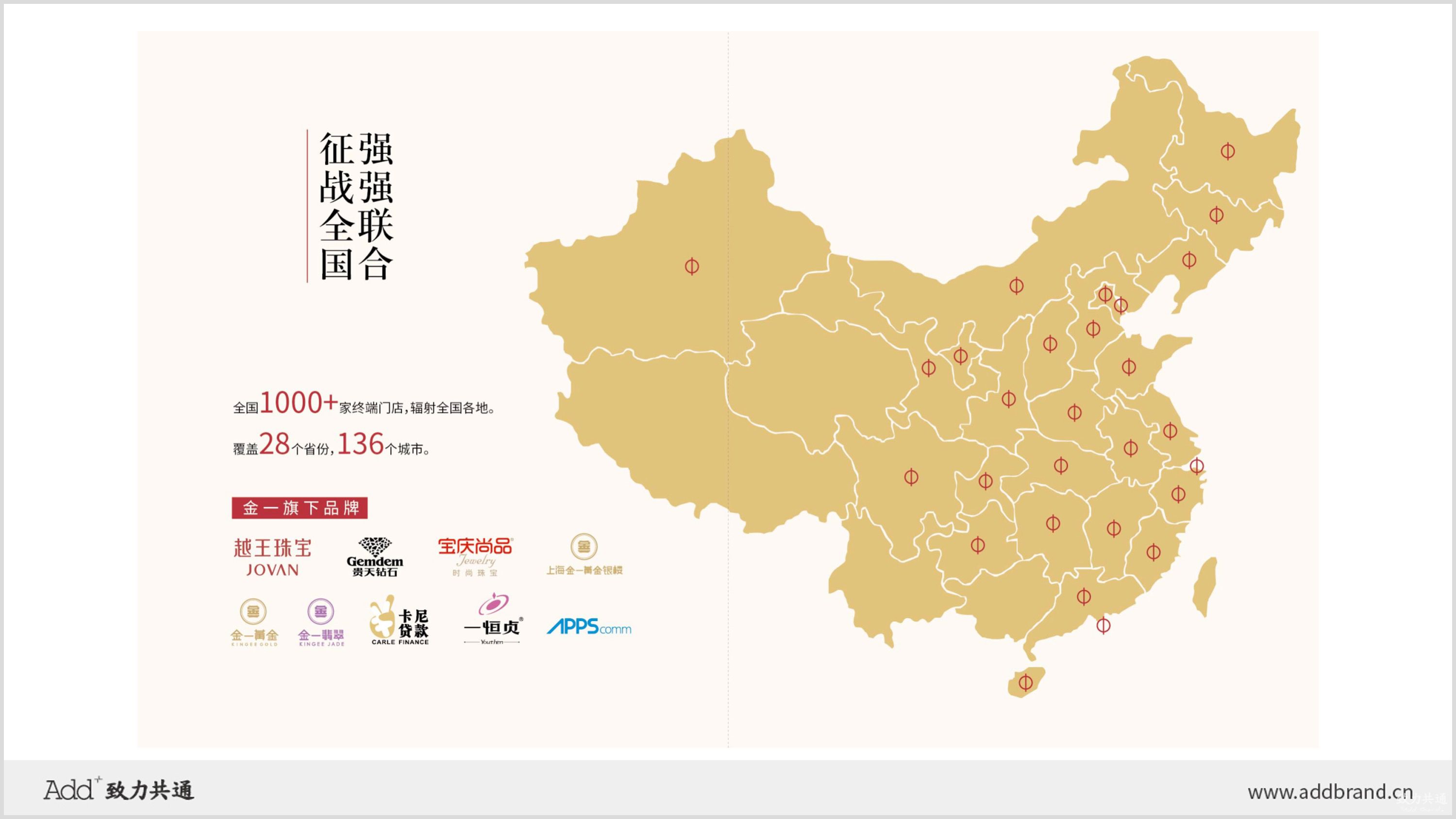2018年,金一文化三度入圍“2017年度中國(guó)黃金珠寶銷售收入十大企業(yè)”。如今,作為國(guó)內(nèi)黃金珠寶行業(yè)的領(lǐng)航品牌、國(guó)資企業(yè),金一擁有1000+家終端門店,覆蓋浙、蘇、哈、皖、豫、贛等國(guó)內(nèi)近30個(gè)省份,遍布全國(guó)186 個(gè)城市,逐步形成了覆蓋全國(guó)的多元業(yè)務(wù)模式與企業(yè)經(jīng)營(yíng)體系。