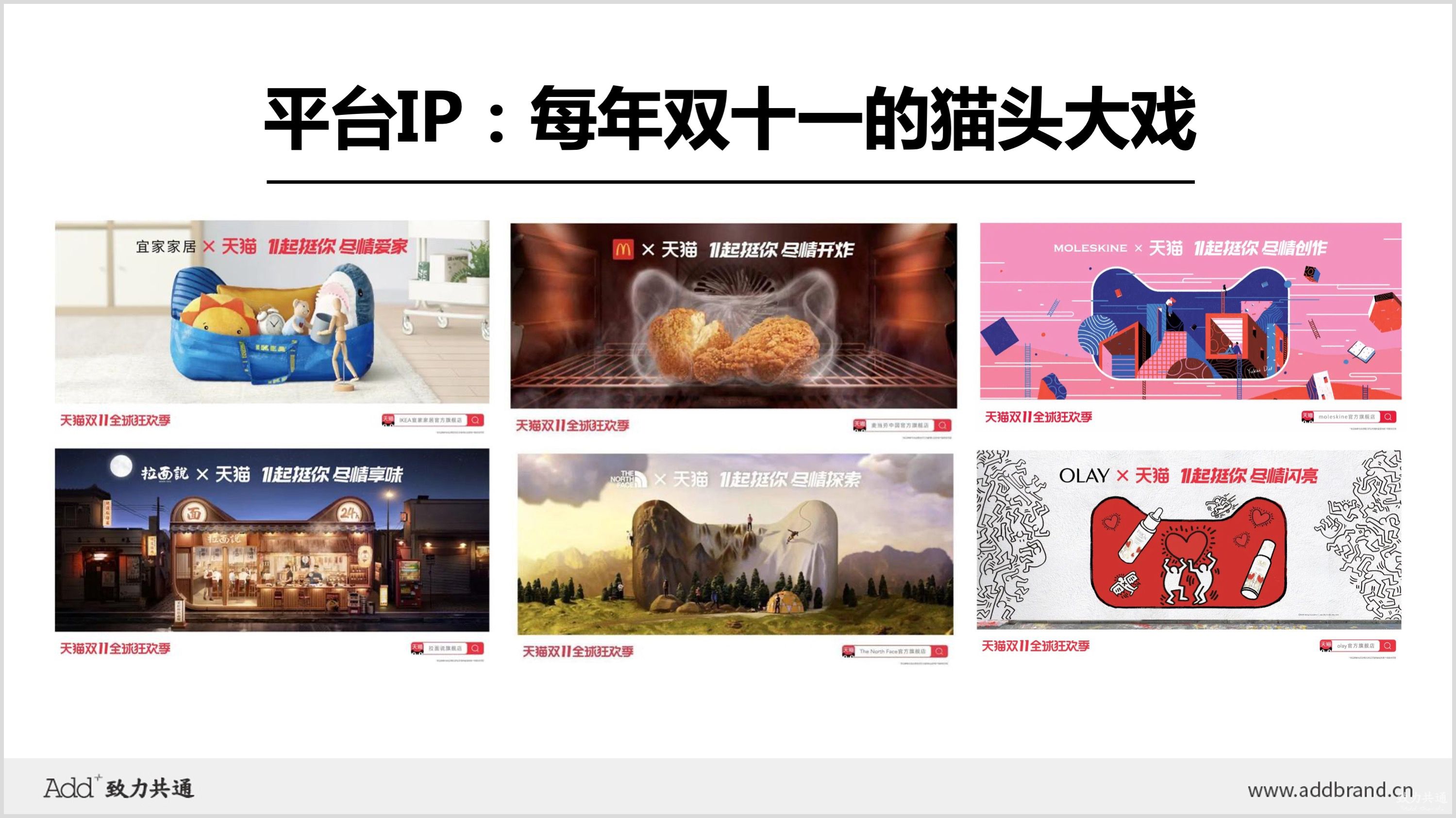 像大家現(xiàn)在看到的這一系列海報(bào),就是天貓雙11前夕推出的預(yù)熱廣告。“貓頭”這個(gè)IP,就像一把“招搖過(guò)市”的視覺(jué)錘,無(wú)時(shí)無(wú)刻不在提醒并強(qiáng)化電商平臺(tái)的屬性。